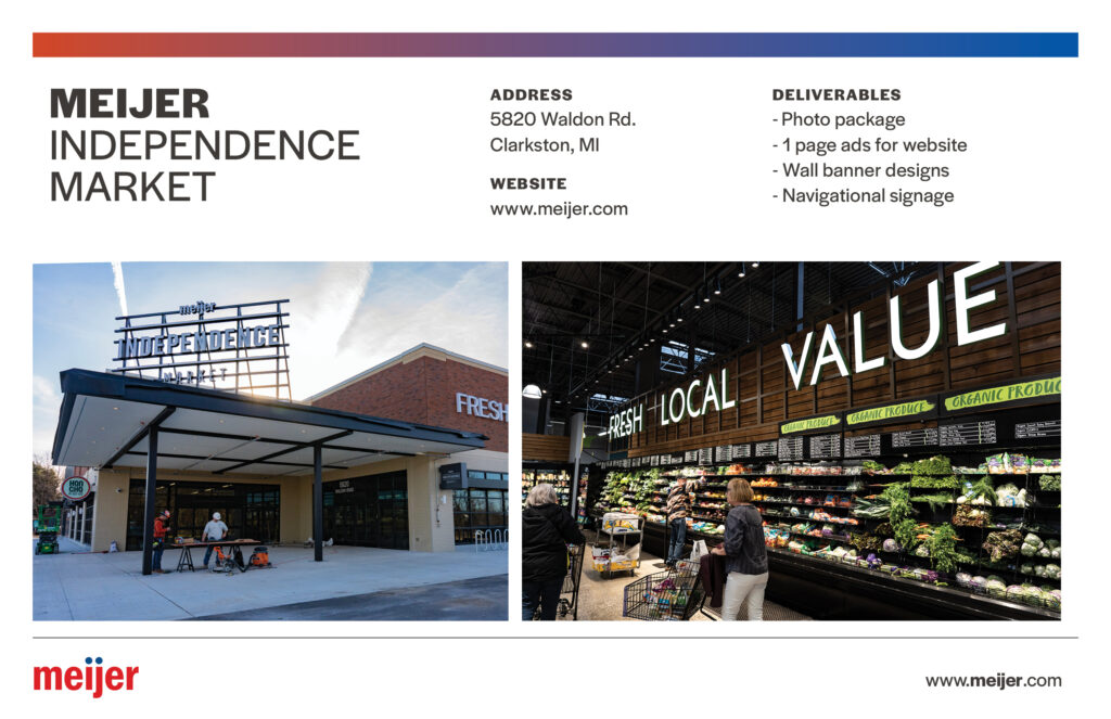 Siwek is the primary construction company for all private-label Meijer locations in Michigan, and needed a local designer to handle photography for all new builds, along with various branding and marketing assets. This includes full photography portfolios of each build, pitch decks, 1-page briefs, in-store directional signage, and other various creative assets.
