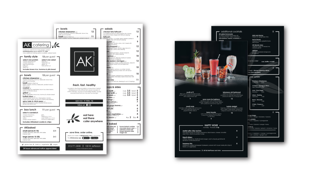 A scalable branding package allowed Anita’s Kitchen to expand from 1 to 4 locations across southeast Michigan, along with placement in the Detroit Metro Airport, where they feed thousands of travelers each week. Intuitive and visually appealing menu designs allow for efficient ordering, along with transparency in regard to allergies and cooking conditions (raw, halal, etc.), which is essential in todays market. This updated, unified identity grows continued trust in the brand due to cohesion between locations, simplified messaging, and impactful graphics.